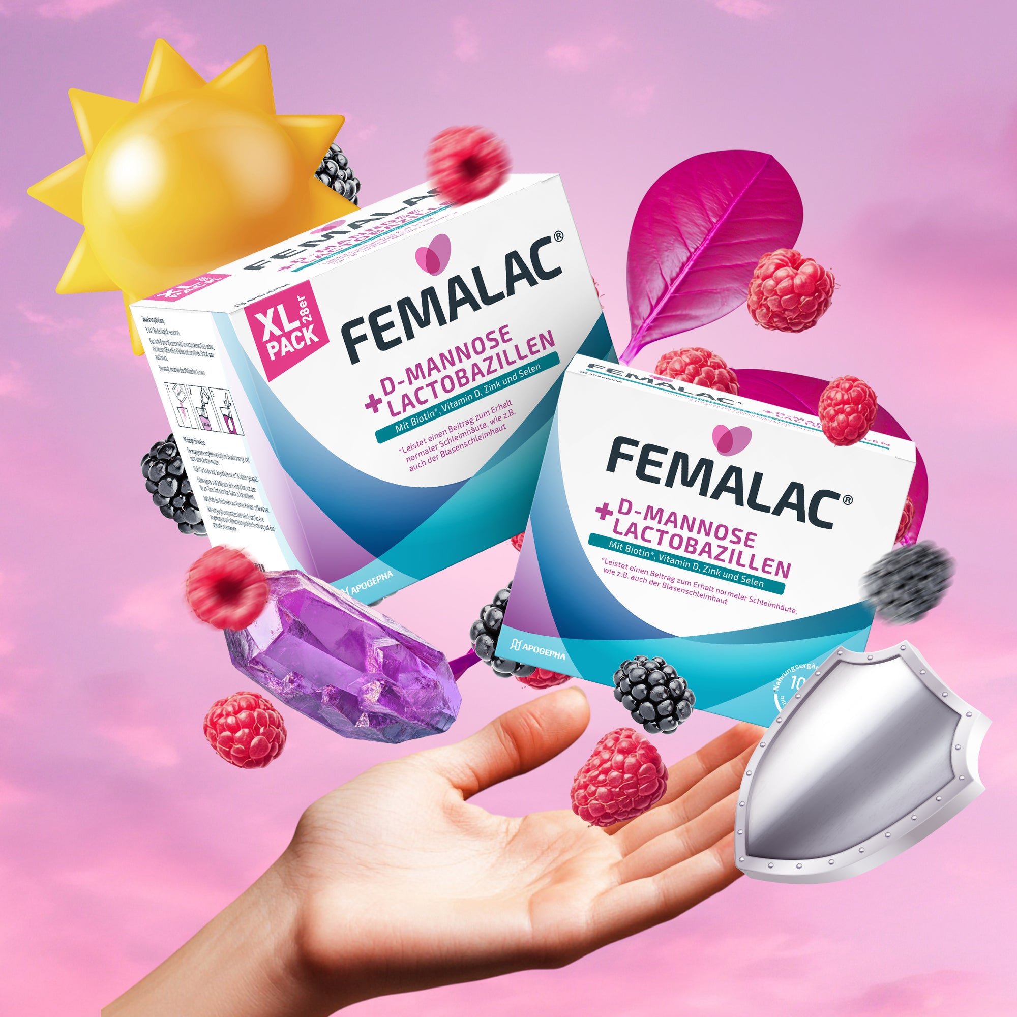 FEMALAC® ist ein Nahrungsergänzungsmittel, das entwickelt wurde, um Frauen gezielt zu unterstützen. Es kombiniert eine Duo-Aktiv-Formel aus D-Mannose und Lactobazillen mit einer Auswahl wichtiger Vitamine, Mineralstoffe und Spurenelemente.